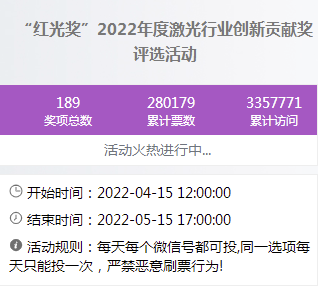 自4月15日投票通道开启以来,由中国激光行业创新贡献奖组委会、激光制造网主办,联合国内多家激光行业协会、激光学会、激光产业联盟、行业媒体协办的“红光奖”第五届激光行业创新贡献奖网络投票可谓是热火朝天。投票开始后,133家入围企业开启了“疯狂”宣传、“花式”拉票模式,微信群、朋友圈出现刷屏、霸屏现象。个人、企业、社会各界纷纷为参评企业摇旗呐喊,让激光科技惠及各行各业。